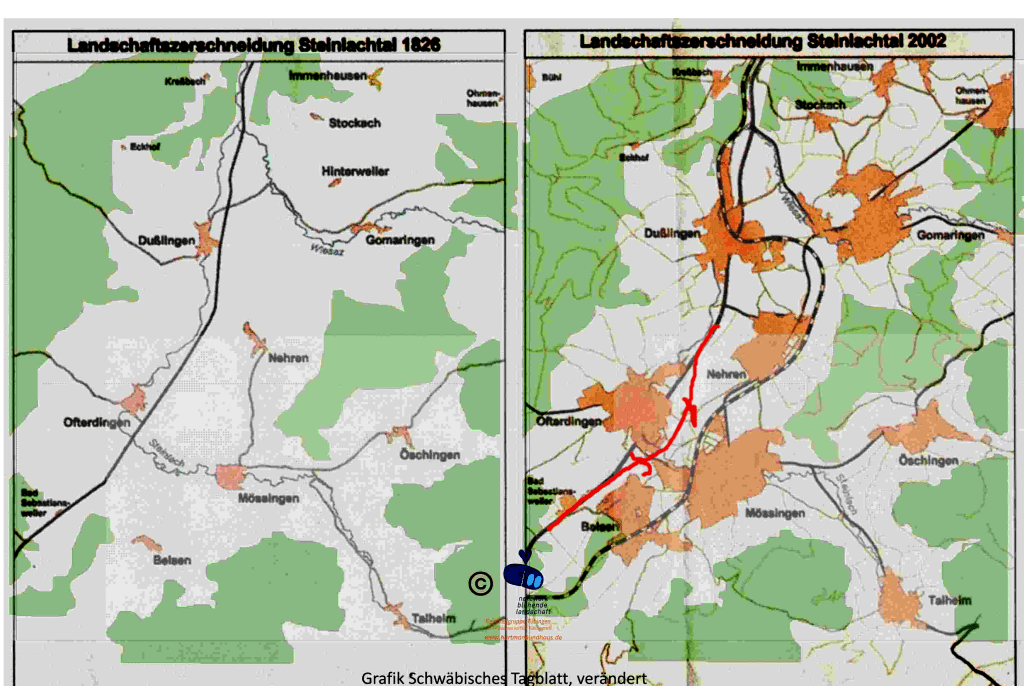 Wollen wir mal den Vergleich zu machen zwischen den tatsächlich in OFTERDINGEN betroffenen dort lebenden Menschen und denen, die durch die neue Trassenführung in BAD SEBA, BÄSTENHARD, NEHREN, OFTERDINGEN (Ehrenberg) und MÖSSINGEN betroffen sein werden. Abgesehen davon finde ich es übrigens echt schäbig, den Friedhof quasi nachträglich an eine Hauptverkehrsader zu setzen. Aber das ist was Persönliches. Vielleicht nur kurz zur Dokumentation, dass die armen Ofterdinger ihr Dorf wohlweislich RUND HERUM um die jetzige B27 gebaut haben, ein kleines Bildle, das mir von Manuel Haus, aktiv im „Netzwerk Streuobst“ zur Verfügung gestellt und dem Tagblatt entnommen und dann etwas durch das Zufügen von Waldstruktur verändert wurde – naja, und etwas naiv habe ich die künftuge B27 eingezeichnet 😉 – es ging ja darum, zu zeigen, dass Ofterdingen wirklich selbst ein Stück weit zur aktuellen Misere beigetragen hat, die nun alle umliegenden Gemeinden ausbaden müssen. Ofterdingen ist deswegen auch gut geeignet um eines zu zeigen (wenn jetzt jemand arguuentiert, das habe man ja NIE wissen können, wie sich der Verkehr in 200 Jahren entwickelt!): STRASSEN ZIEHEN VERKEHR AN. Deswegen wird die B27-neu auch nicht das Allheilmittel sein, sondern so lange, wie es den Individualverkehr gibt, was während der Bauzeit der geplanten Trasse noch der Fall sein, danach aber abnehmen soll – in der Folge auch eben dies tun….