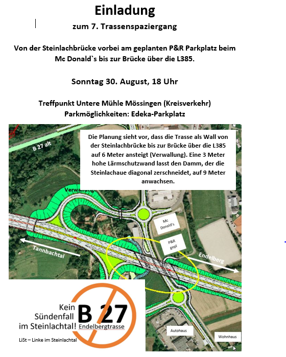 … lädt die Gruppe „B27 – Kein Sündenfall im Steinlachtal“ zur Begehungen neuralgischer Orte in der Planung der B27-Endelbergtrasse ein. Heute wird es sicher ganz spannend, wenn einem bewusst wird, dass der Radweg der künftigen Kinder unter einem Baumonument erster Güte durch führen wird. Die Neubauten am Ortseingang, die heute im Tagblatt gescholtenen „Göhner Mehrfamilienhäuser“ dürften dann Ofterdingens kleinster Schandfleck an dieser Stelle sein, der wahrnehmbar ist…..