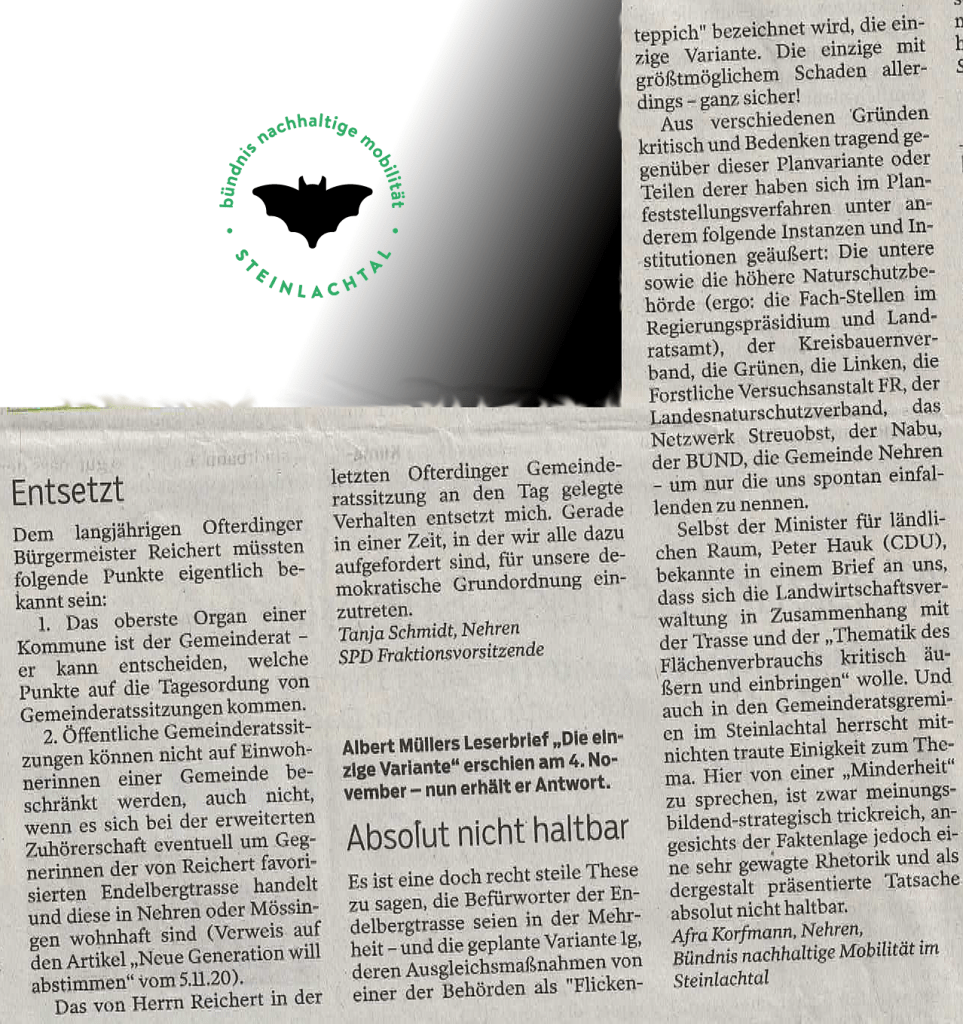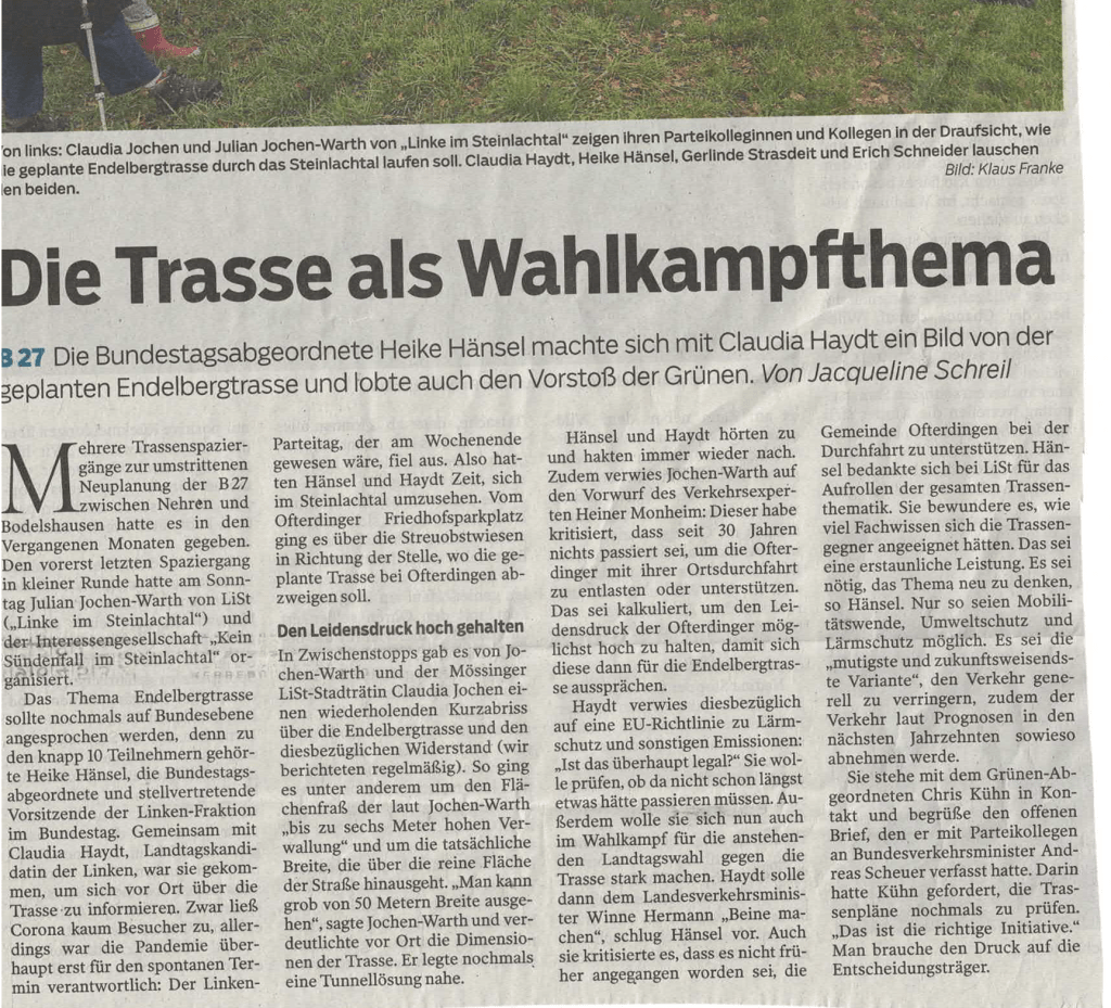 Einfacher ist es immer, am „endlich Erreichten“ festzuhalten. Einfacher ist es immer, nicht nach links oder rechts zu schauen, sondern sich, wie die SPD, schön in der Mitte einzupendeln. Das ist aber kein Weg, den wir beschreiten. Unsere Schwesterinitiative „Kein Sündenfall im Steinlachtal“ hat sich mal wieder mutig frisch ans Werk gemacht, die linken Politiker*innen zu informieren.
