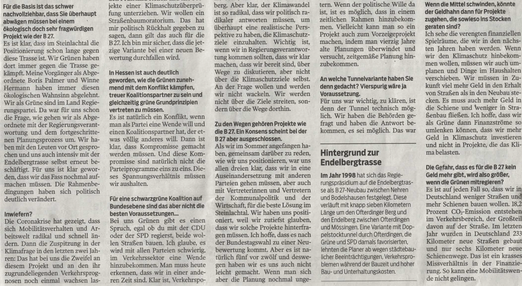 Nichtsdestotrotz verstehen wir, was da zwischen den Zeilen im Gespräch mit Winne Hermann gesagt wurde und was wir uns ja selbst schon dachten: deklariert Ofterdingen den Willen, umzuschwenken und sich für eine Tunnellösung auszusprechen, besteht die Möglichkeit, dies zu tun. Das ist anstrengend und erfordert klare Kante. Da mag man, wie Herr Rosemann von der SPD es in einem Leserbrief tut, eher die bequeme Position einnehmen wollen: