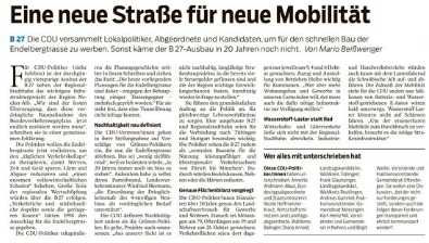 Die CDU hat am 12.12. im Steinlachboten mal ein ordentliches Statement platziert: „Eine neue Straße für neue Mobilität“, so wurde die Aussage der CDU zum notwendigen Ausbau der B27 zwischen Nehren und Bodelshausen betitelt. Und ich dachte mir: „Neue Mobilität? Haben die etwa echt neue, progressive Vorschläge? Vielleicht sogar schon in Abstimmung mit dem Bundes-Verkehrs-Andi, der ja auch gerne mal von Flugtaxis schwärmt?“.