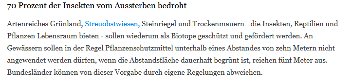Gerade heute allerdings wurde ein Gesetzesentwurf durch den Bundestag befürwortet, der nun tatsächlich das Potential hat, neben allen anderen bereits genannten Fakten, den Bau unter die Erde zu verlegen: das sogenannte „Insektenschutzgesetz“ (Memo an mich: Bundesumweltministerium mit hinzuziehen!), dementsprechend artenreiches Grünland und Streuobstwiesen – wie sie trotz anderslautender Demagogie durchaus auf dem Endelberg recht augenscheinlich vorhanden sind, unter Schutz gestellt werden. Was wiederum bedeutet, dass wenigstens der ökologische Wert, der im Plan der Endelbergtrasse ignoriert und von der CDU negiert wird, fortan auf Bundesebene Relevanz besitzen wird. Zu dumm…