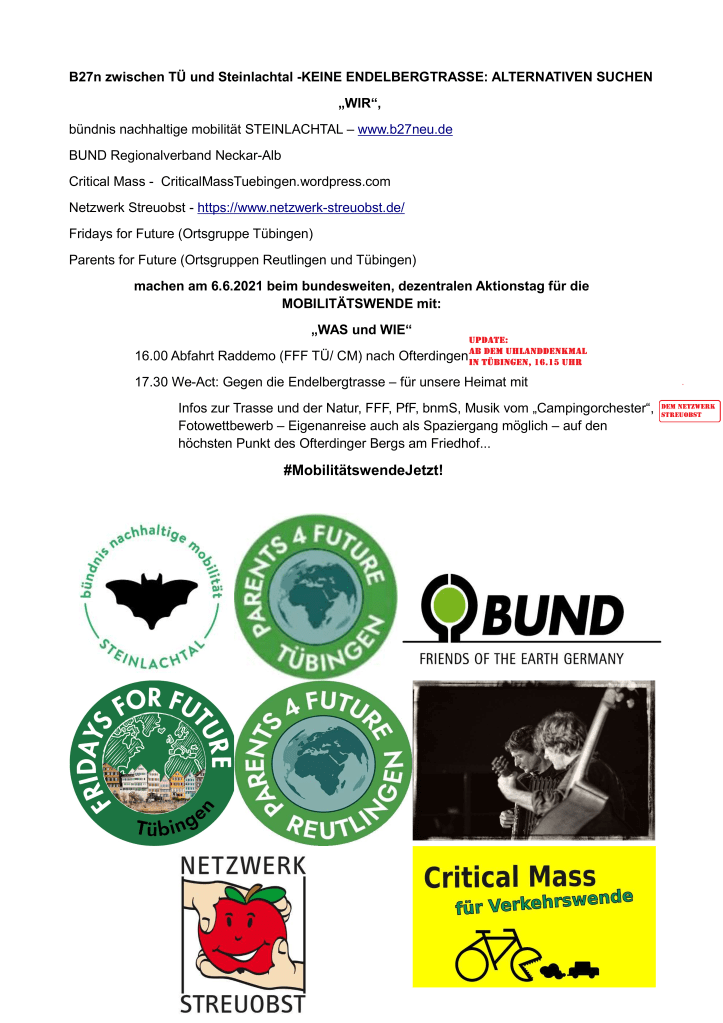 Ehe die endgültige Route bekanntgegeben wird, hier zunächst einmal das Update zum Abfahrtsort der Fahrraddemo in TÜ – das UHLANDDENKMAL um 16.15 ist der Abfahrtssammelpunkt. Rock the world and roll the streets!