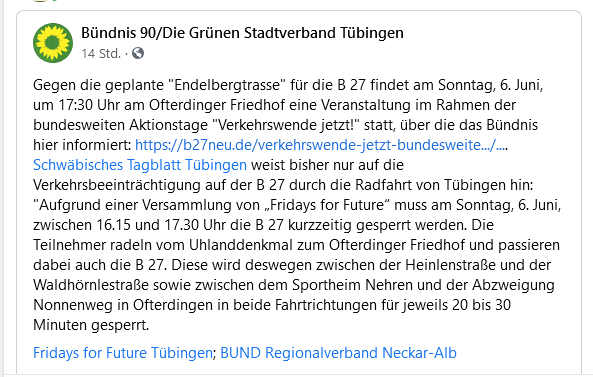 Um 17.30, hoffentlich in der schönen Spätnachmittagssonne, wird es bei einem Picknick am Endelberg (Friedhof Ofterdingen) Informationen zum Thema „Endelbergtrasse“, Mobilitätswende“, „Artenschutz“ geben.