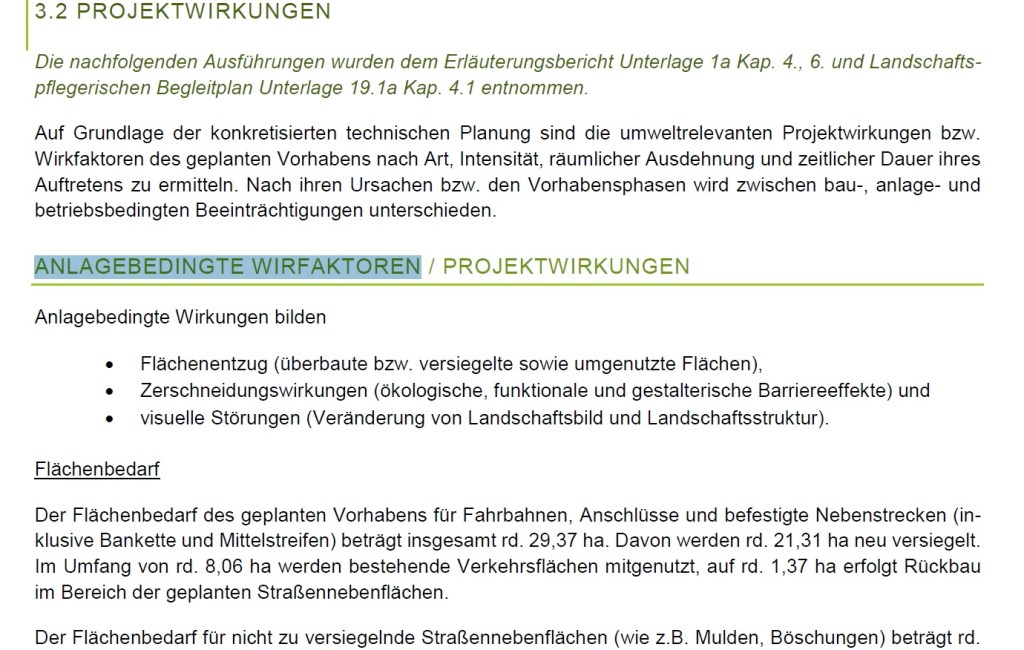 Der Flächenbedarf des geplanten Vorhabens für Fahrbahnen, Anschlüsse und befestigte Nebenstrecken (inklusive Bankette und Mittelstreifen) beträgt insgesamt rd. 29,37 ha. Davon werden rd. 21,31 ha neu versiegelt.