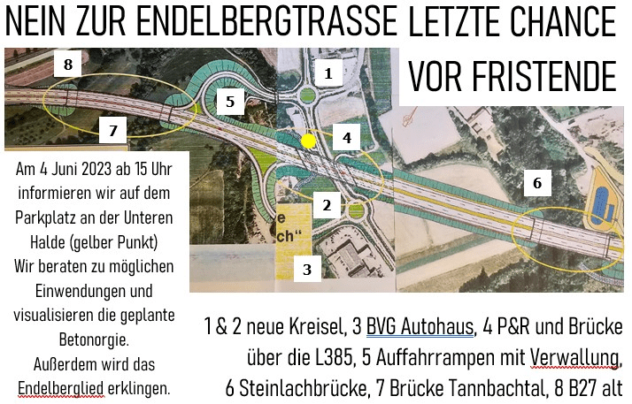 Oh, und morgen werden die Mitstreiterinnen der BI „Kein Sündenfall im Steinlachtal“ auch nochmal persönlich zur Verfügung stehen und aufklären. Besonders eindrücklich dürfte dabei auch der „Endelbergsong“ werden – DANKE auch dafür, auch wenn es schade ist, dass wir ihn überhaupt noch brauchen…